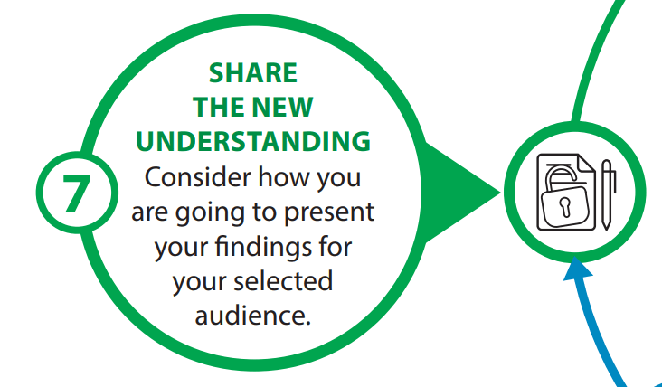 There are many ways to share your research findings, such as a structured article to be published in an organisational research journal, a digital presentation or notes to support a verbal presentation to a group of colleagues. It is important that you take ownership of this step in the Research Cycle; in doing so, you will become increasingly confident about sharing your research findings with others.