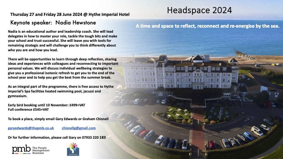 For more information about my consultancy offer, please visit my website here. My latest consultancy offer includes Coaching for Appraisal, a course that prepares leaders and staff for impactful appraisals. This course is co-facilitated with HR expert Gary Edwards. I will also be co-facilitating Headspace, a residential recharge for school and trust leaders on 27 and 28 June 2024 at the beautiful venue of Hythe Imperial Hotel in Kent (flyer for this later in this edition). Let me know if you would like to secure a place for you and your team.